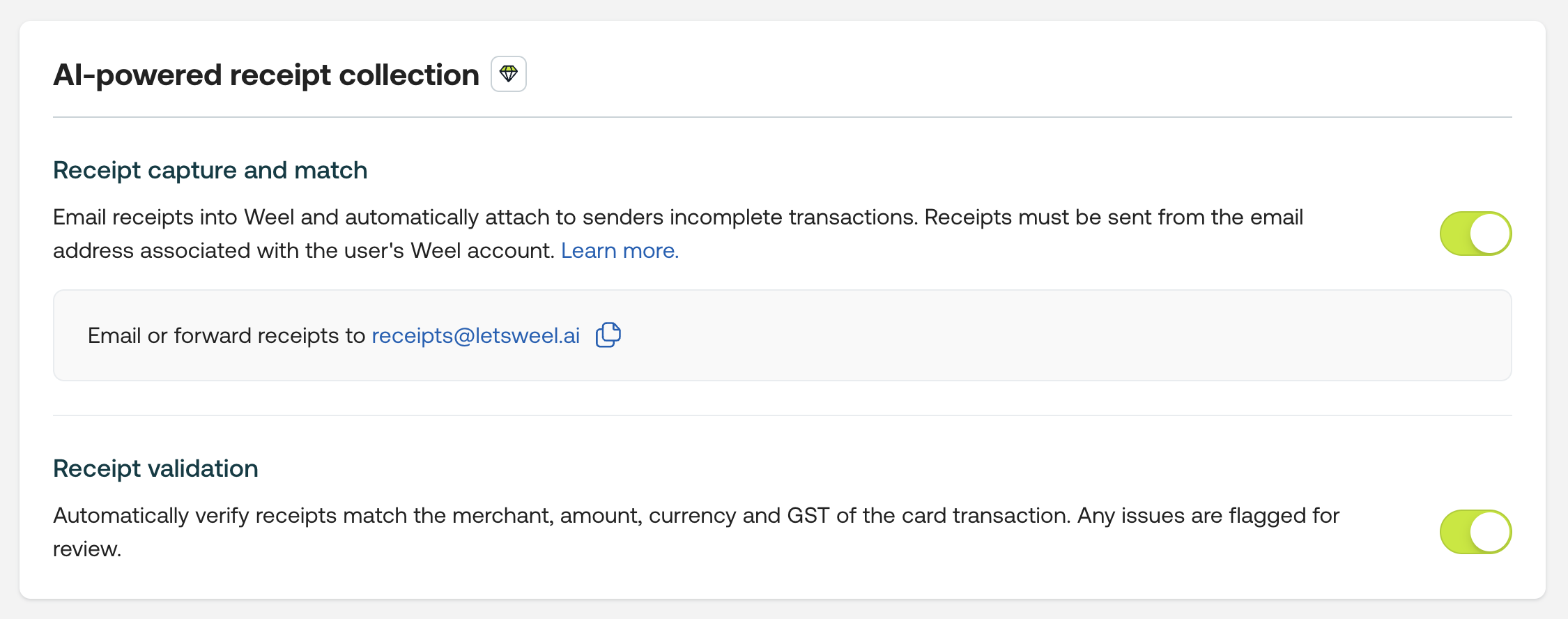 Under AI-powered receipt collection, enable Receipt capture and match.