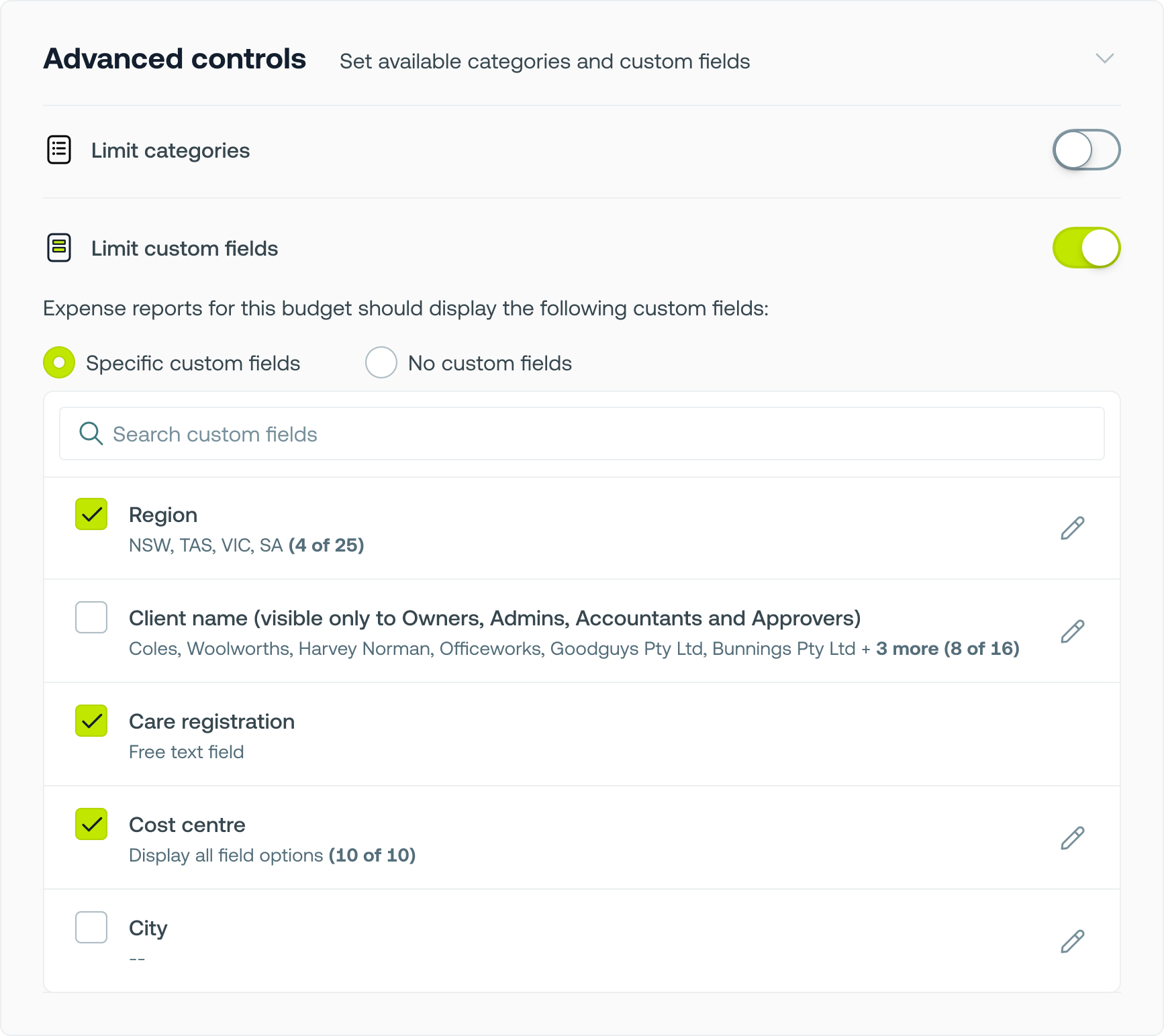 You’ll see all your existing custom fields listed — click the ✏️ icon to choose which options should appear for that budget.
