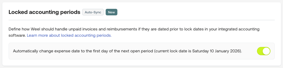 Automatic locked Period Handling prevents export errors for invoices and reimbursements that are awaiting coding or approval). When enabled, Weel detects that the expense date fall into a locked Xero period and automatically updates the expense date to the first open day after the lock date. So you can process the invoice or reimbursement without unlocking periods in Xero.
