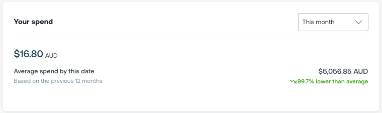 Get an at-a-glance view of your personal spend compared to your 12-month historical average. Use the period filter to focus on a specific timeframe — choose from This Month, Last Month, This Quarter, Last Quarter, This Year, or Last Year.