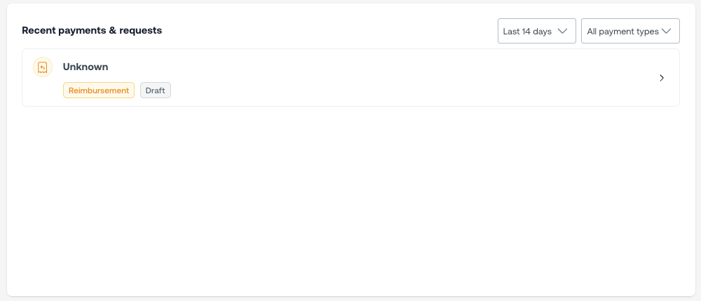 See the status of your submitted top-up requests, invoices, reimbursements, and purchase orders at a glance. Filter by payment type or use the period filter to show items from the last 14 or 30 days. Click any row to go directly to that item's detail page.