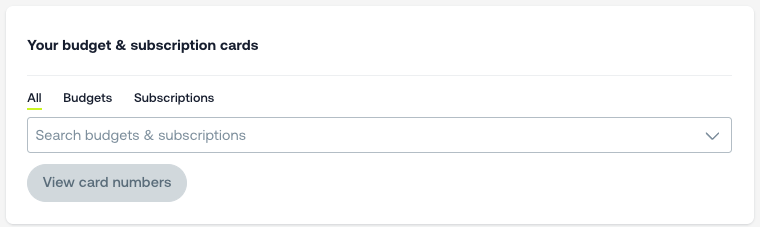 See all budget and subscription cards assigned to you in one place. Use the Budgets and Subscriptions tabs to filter your view, or search by card name to find what you need quickly.