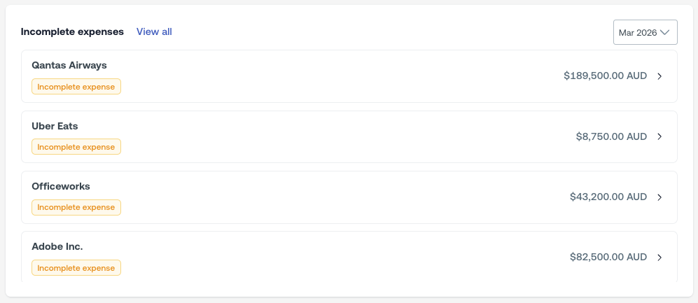 Keep track of any transactions that are missing details and need to be completed. Click any expense to open it, fill in the required fields, and use Save and next to move through your list without losing your place. Click View all to see your full list of incomplete expenses in the Transactions page.