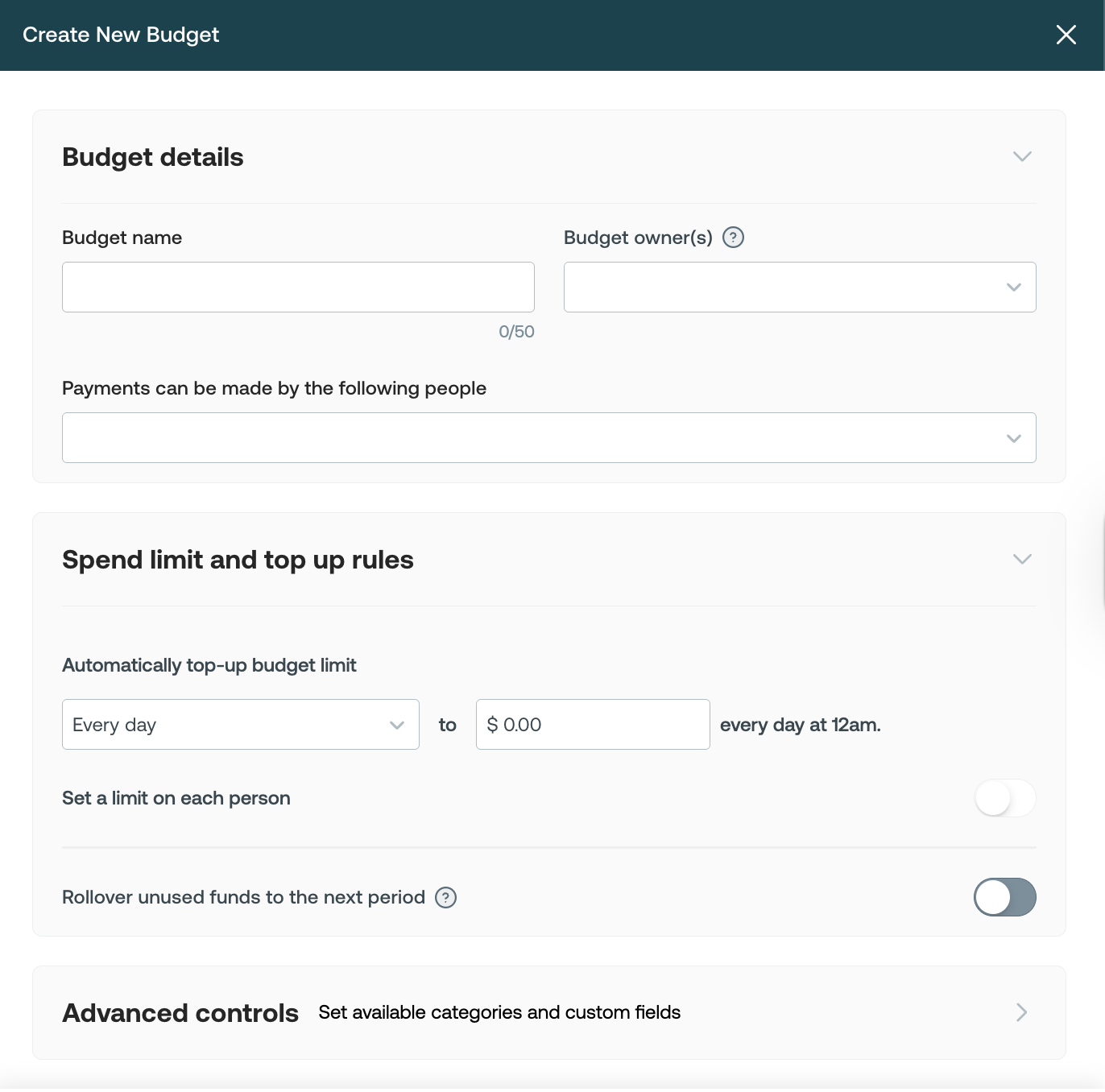- (Optional) Set individual card limits. Toggle on Set individual card limits to assign a specific spending limit per cardholder. Individual card limits must add up to the total budget limit. Leave this off to allow all cardholders to draw from the shared budget limit.