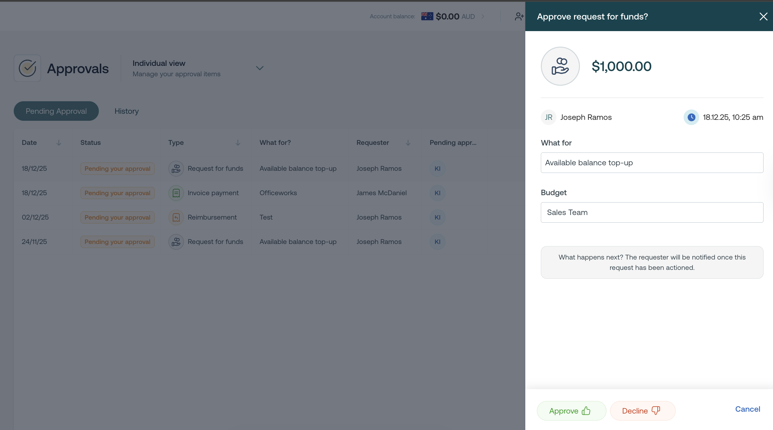 Once you approve or decline a request, the submitter is notified by email and push notification. Approved items will move forward in the workflow, while declined items are archived and will not be processed for payment. If Decline Comments are enabled, the submitter will receive your reason and may be able to resubmit with corrections.