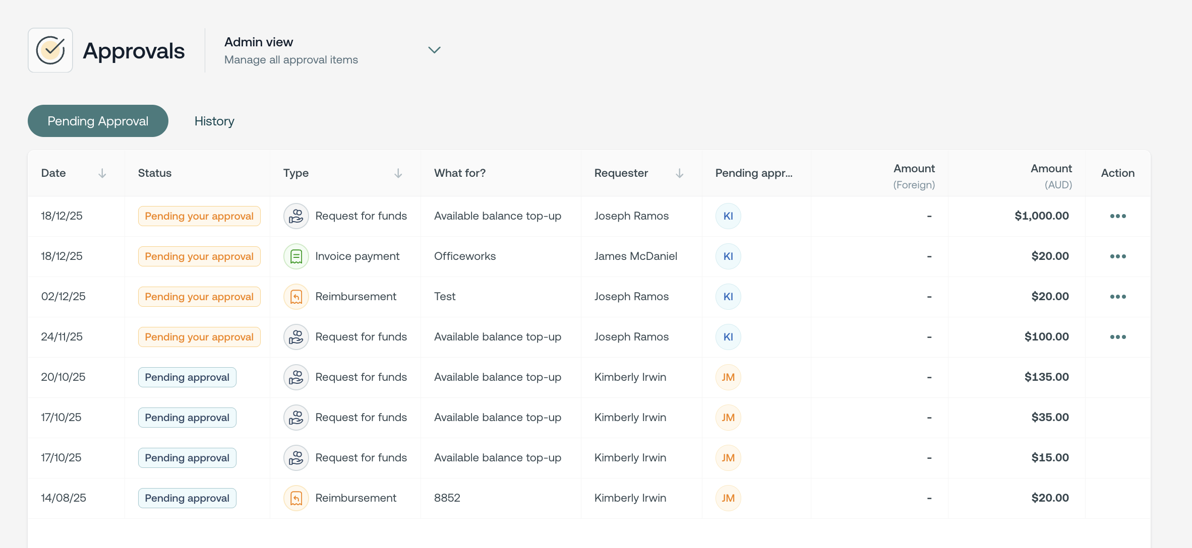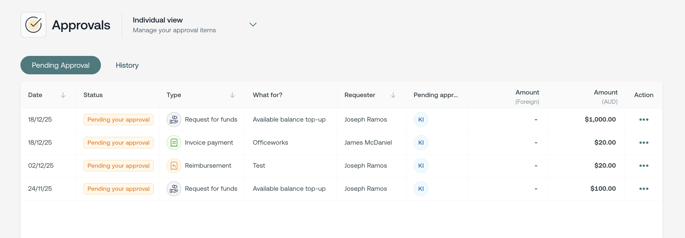 - Use the view filter at the top of the page to select My approvals to see only the items pending your action.